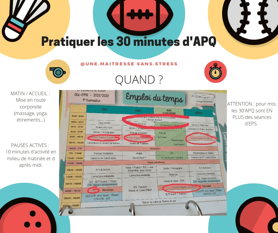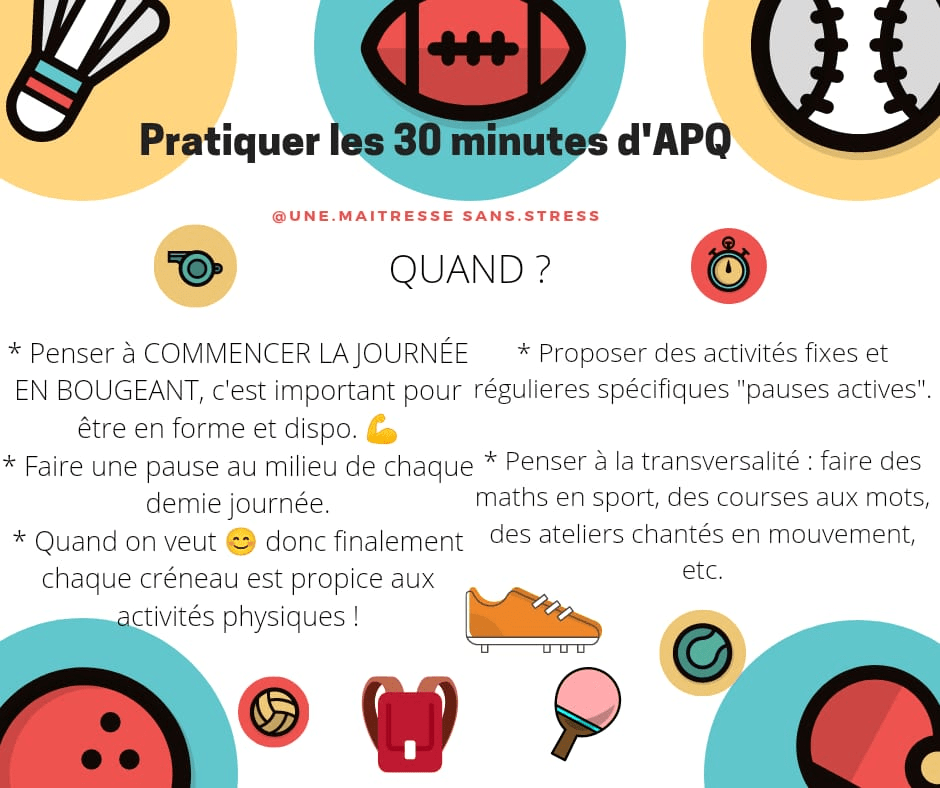 Depuis presque deux ans maintenant, j’ai mis en place 30 minutes d’activitĂ© physique quotidienne dans ma classe. A la rentrĂ©e, le dispositif va ĂȘtre Ă©tendu dans le cadre de la GĂ©nĂ©ration 2024. J’adore ces diffĂ©rents moments, qu’ils soient informels, inscrits Ă l’emploi du temps ou transversaux.