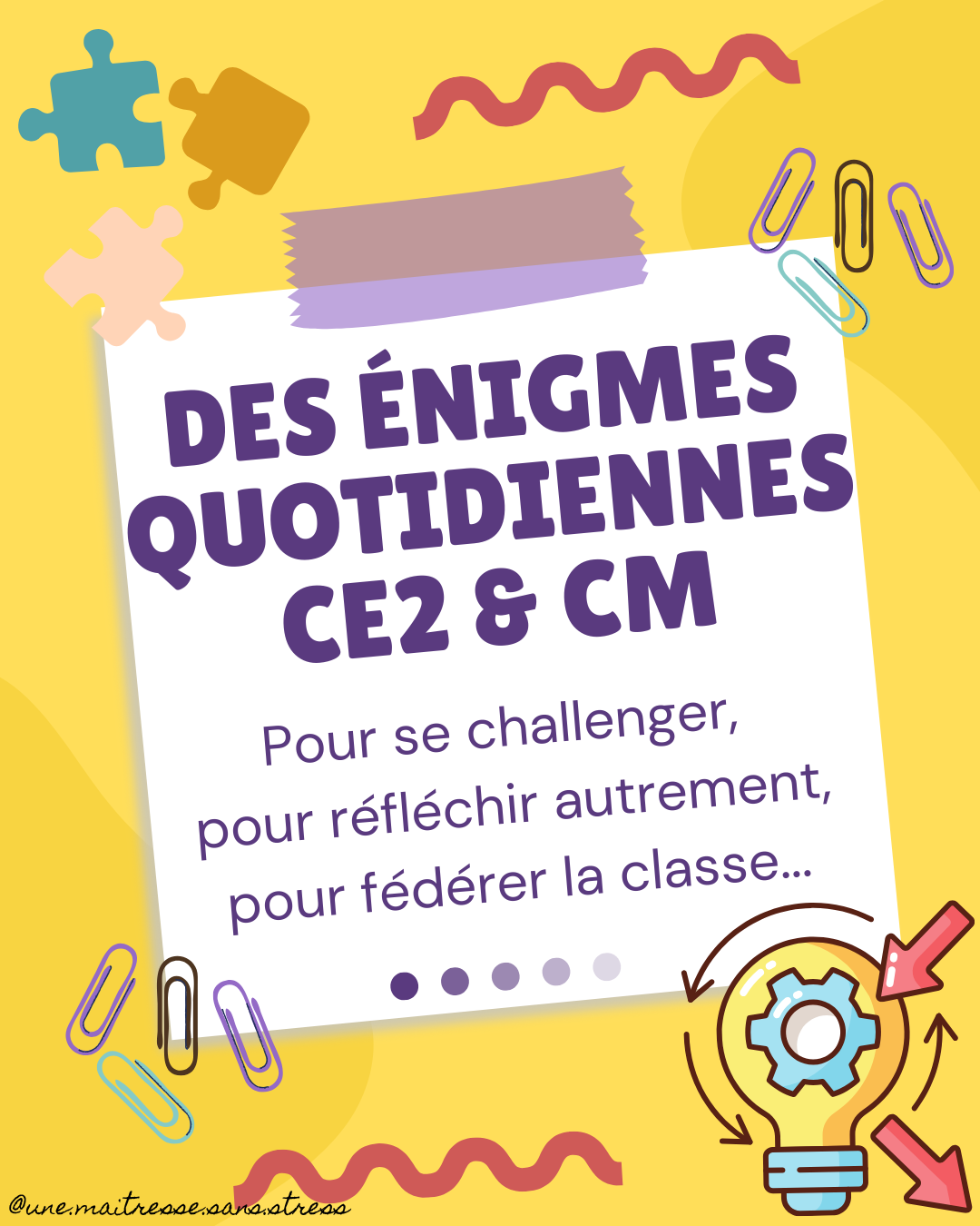 Cette année, j’ai mis en place un nouveau rituel quotidien, sous forme de fil rouge. Tous les matins, j’inscris une énigme sur un petit tableau à l’entrée de ma classe. Et les élèves ont la journée pour trouver une solution (ils peuvent me faire des propositions s’ils le souhaitent dans la journée). Le soir, nous prenons 2 minutes pour en discuter et donner LA réponse. Ça les challenge vraiment, ils adorent ça et désormais, ils m’en proposent même des personnelles pour avoir leur propre énigme au tableau…