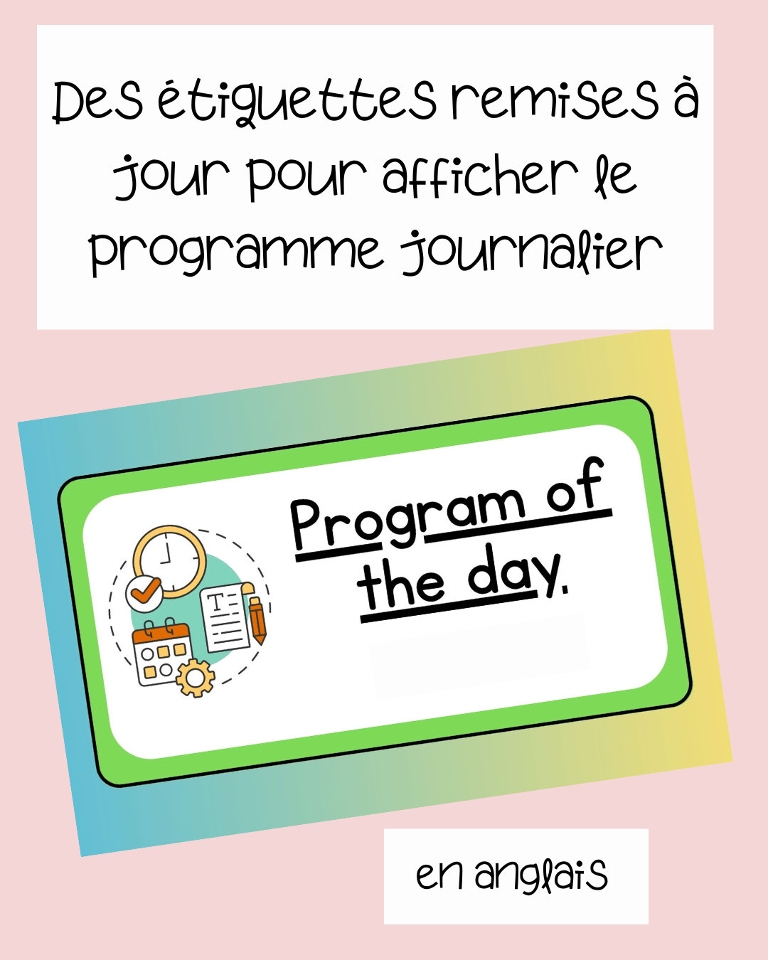 Cela fait plusieurs années que j’aime afficher le programme journalier aux élèves dès le matin, cela permet de les aider à se repérer dans leur emploi du temps mais aussi d’éviter les éternelles questions du genre « Qu’est-ce qu’on fait aprèèèèèèèèès? C’est bientôt l’heure de l’EPS maitresssssssssse ? » 😉 Bref, j’utilisais les affichages dispos sur leLire la suite « Des étiquettes pour le PROGRAMME DU JOUR »